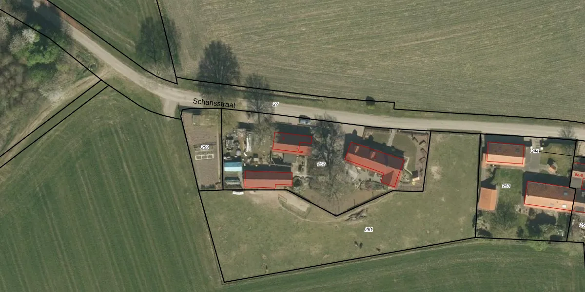 Het perceel waarop Schansstraat 9 staat heeft een oppervlakte van 1874 m². Dit is een zeer groot perceel. De perceeloppervlakte wordt geregistreerd door het Kadaster. Gedetailleerde informatie over de maten van dit perceel kunt u vinden in het rapport Kadastrale kaart met maatvoering van Schansstraat 9.