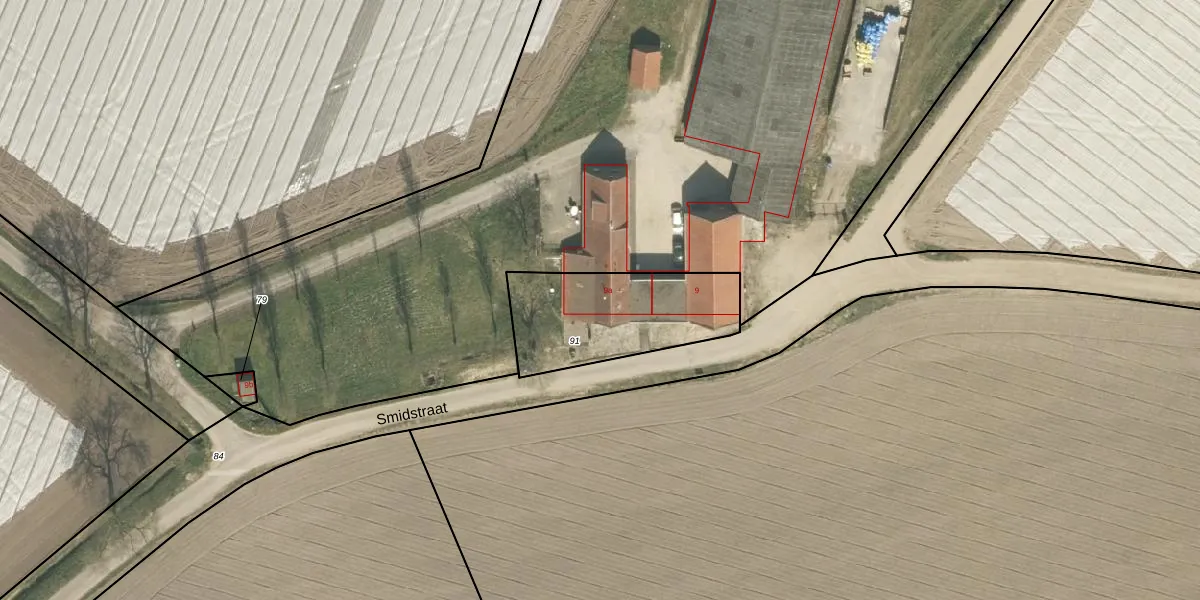 Smidstraat 9 is gelegen op kadastraal perceel HSL00L91. Deze kadastrale aanduiding is uniek en wordt gebruikt door het Kadaster om eigendomsrechten en andere zakelijke rechten vast te leggen. Het perceel maakt onderdeel uit van de kadastrale gemeente Hunsel.