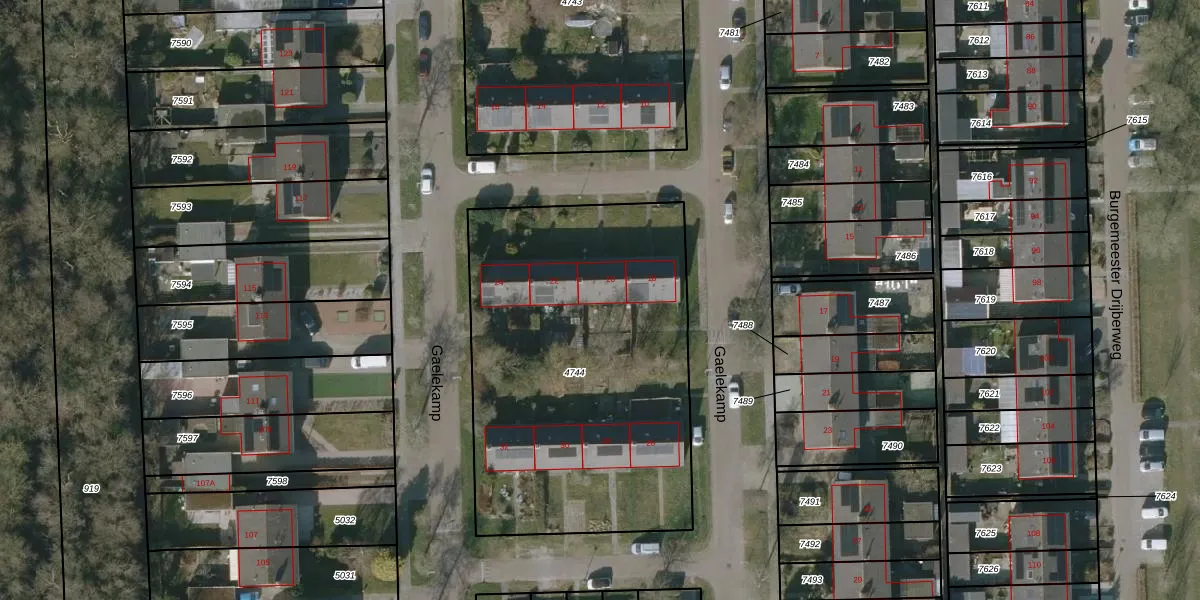Het perceel waarop Gaelekamp 20 staat heeft een oppervlakte van 1979 m². Dit is een zeer groot perceel. De perceeloppervlakte wordt geregistreerd door het Kadaster. Gedetailleerde informatie over de maten van dit perceel kunt u vinden in het rapport Kadastrale kaart met maatvoering van Gaelekamp 20.