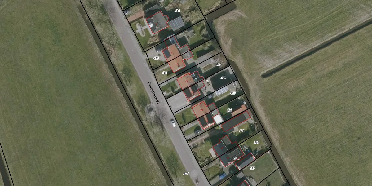 Friesmawei 13 is gelegen op kadastraal perceel RDH00E418. Deze kadastrale aanduiding is uniek en wordt gebruikt door het Kadaster om eigendomsrechten en andere zakelijke rechten vast te leggen. Het perceel maakt onderdeel uit van de kadastrale gemeente Roordahuizum.