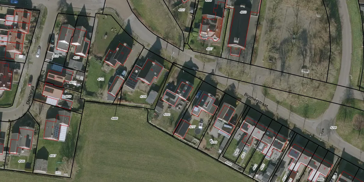 Het perceel waarop Bramerstraat 29 staat heeft een oppervlakte van 565 m². Dit is een groot perceel. De perceeloppervlakte wordt geregistreerd door het Kadaster. Gedetailleerde informatie over de maten van dit perceel kunt u vinden in het rapport Kadastrale kaart met maatvoering van Bramerstraat 29.