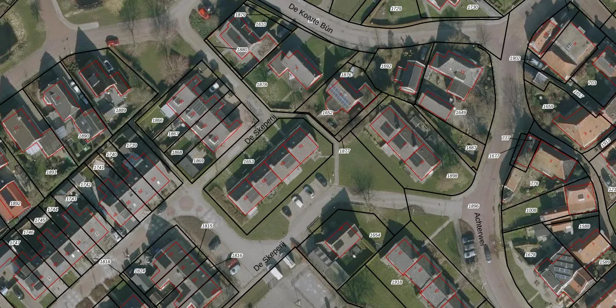 Het perceel waarop De Skeperij 70 staat heeft een oppervlakte van 800 m². Dit is een groot perceel. De perceeloppervlakte wordt geregistreerd door het Kadaster. Gedetailleerde informatie over de maten van dit perceel kunt u vinden in het rapport Kadastrale kaart met maatvoering van De Skeperij 70.