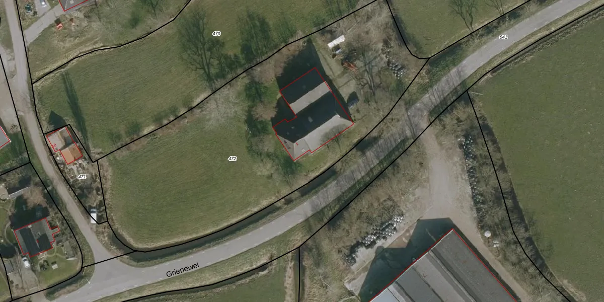 Grienewei 1 is gelegen op kadastraal perceel EEX00H472. Deze kadastrale aanduiding is uniek en wordt gebruikt door het Kadaster om eigendomsrechten en andere zakelijke rechten vast te leggen. Het perceel maakt onderdeel uit van de kadastrale gemeente Ee.
