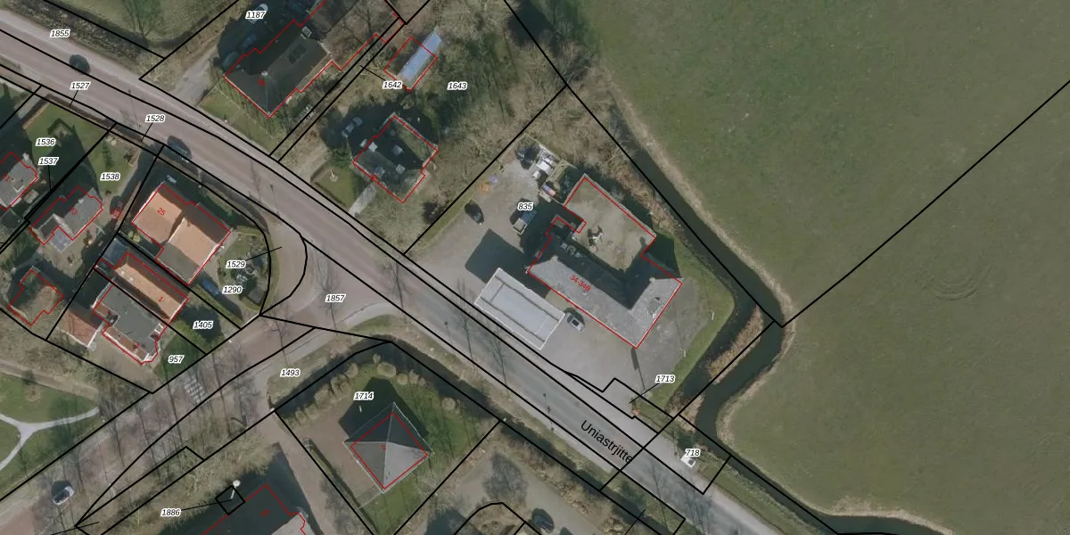 Het perceel waarop Uniastrjitte 34 staat heeft een oppervlakte van 2080 m². Dit is een zeer groot perceel. De perceeloppervlakte wordt geregistreerd door het Kadaster. Gedetailleerde informatie over de maten van dit perceel kunt u vinden in het rapport Kadastrale kaart met maatvoering van Uniastrjitte 34.