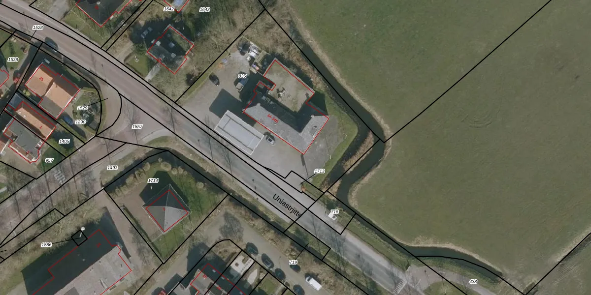 Het perceel waarop Uniastrjitte 34-B staat heeft een oppervlakte van 2080 m². Dit is een zeer groot perceel. De perceeloppervlakte wordt geregistreerd door het Kadaster. Gedetailleerde informatie over de maten van dit perceel kunt u vinden in het rapport Kadastrale kaart met maatvoering van Uniastrjitte 34-B.