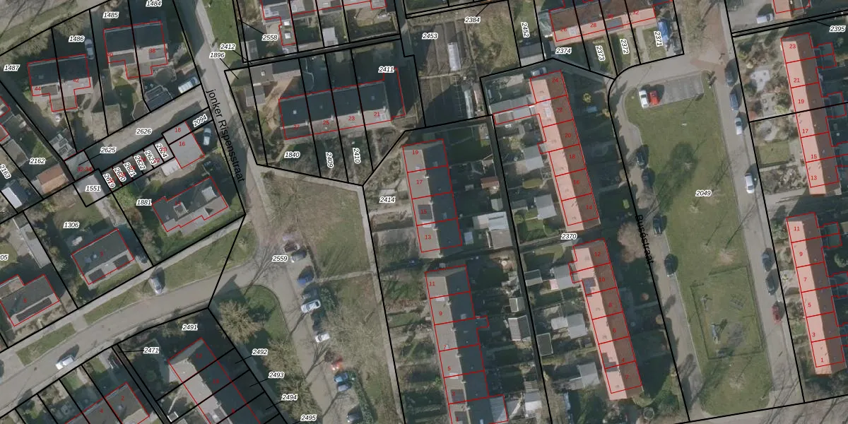 Het perceel waarop jonker Rispensstraat 15 staat heeft een oppervlakte van 2590 m². Dit is een zeer groot perceel. De perceeloppervlakte wordt geregistreerd door het Kadaster. Gedetailleerde informatie over de maten van dit perceel kunt u vinden in het rapport Kadastrale kaart met maatvoering van jonker Rispensstraat 15.