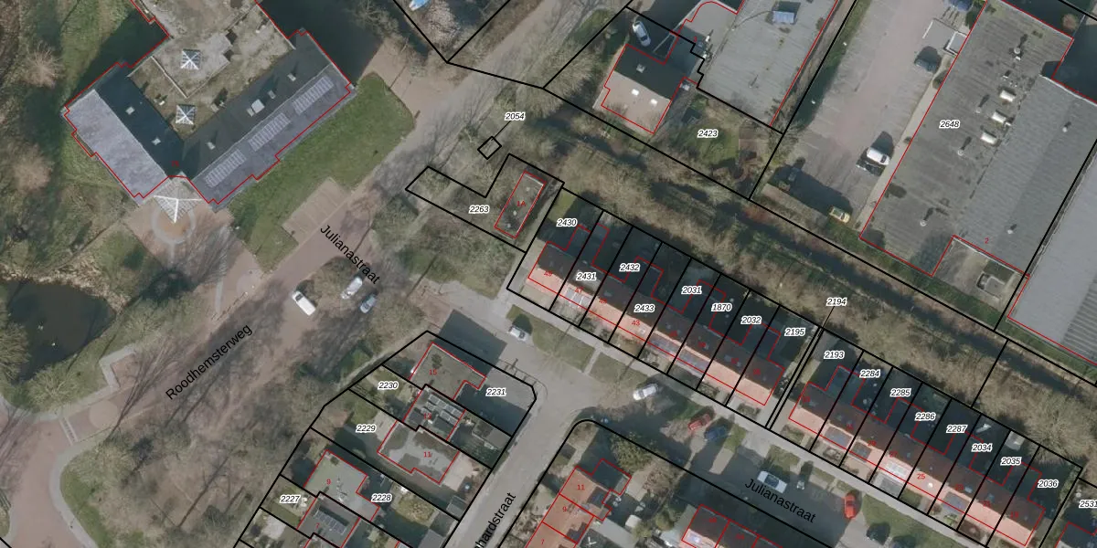 Het perceel waarop Julianastraat 49 staat heeft een oppervlakte van 182 m². Dit is een middelgroot perceel. De perceeloppervlakte wordt geregistreerd door het Kadaster. Gedetailleerde informatie over de maten van dit perceel kunt u vinden in het rapport Kadastrale kaart met maatvoering van Julianastraat 49.