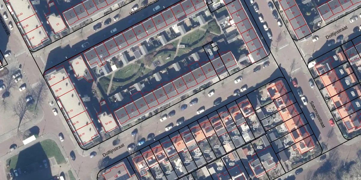 Het perceel waarop Dolfijnstraat 39 staat heeft een oppervlakte van 5648 m². Dit is een zeer groot perceel. De perceeloppervlakte wordt geregistreerd door het Kadaster. Gedetailleerde informatie over de maten van dit perceel kunt u vinden in het rapport Kadastrale kaart met maatvoering van Dolfijnstraat 39.