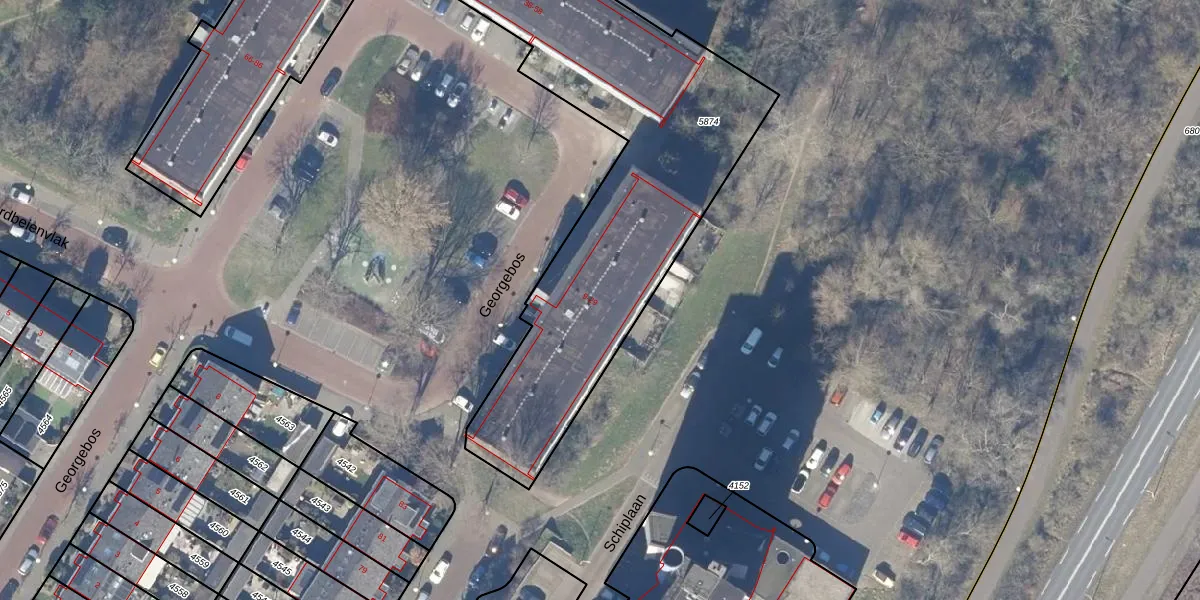 Georgebos 21 is gelegen op kadastraal perceel IMD00L5874. Deze kadastrale aanduiding is uniek en wordt gebruikt door het Kadaster om eigendomsrechten en andere zakelijke rechten vast te leggen. Het perceel maakt onderdeel uit van de kadastrale gemeente IJmuiden.