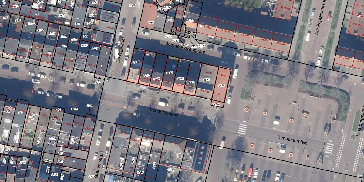 Kennemerlaan 57 is gelegen op kadastraal perceel IMD00L3652. Deze kadastrale aanduiding is uniek en wordt gebruikt door het Kadaster om eigendomsrechten en andere zakelijke rechten vast te leggen. Het perceel maakt onderdeel uit van de kadastrale gemeente IJmuiden.
