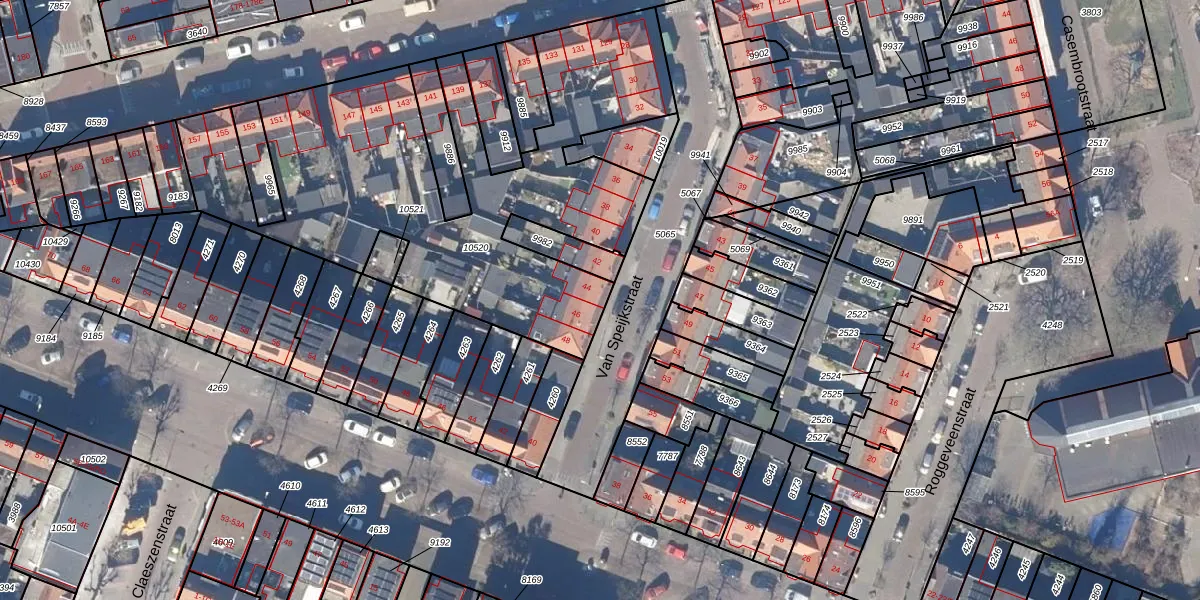 Het perceel waarop Van Speijkstraat 44 staat heeft een oppervlakte van 2228 m². Dit is een zeer groot perceel. De perceeloppervlakte wordt geregistreerd door het Kadaster. Gedetailleerde informatie over de maten van dit perceel kunt u vinden in het rapport Kadastrale kaart met maatvoering van Van Speijkstraat 44.