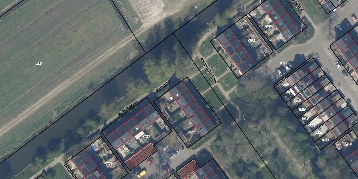 Het perceel waarop Alexandrietpad 39 staat heeft een oppervlakte van 752 m². Dit is een groot perceel. De perceeloppervlakte wordt geregistreerd door het Kadaster. Gedetailleerde informatie over de maten van dit perceel kunt u vinden in het rapport Kadastrale kaart met maatvoering van Alexandrietpad 39.