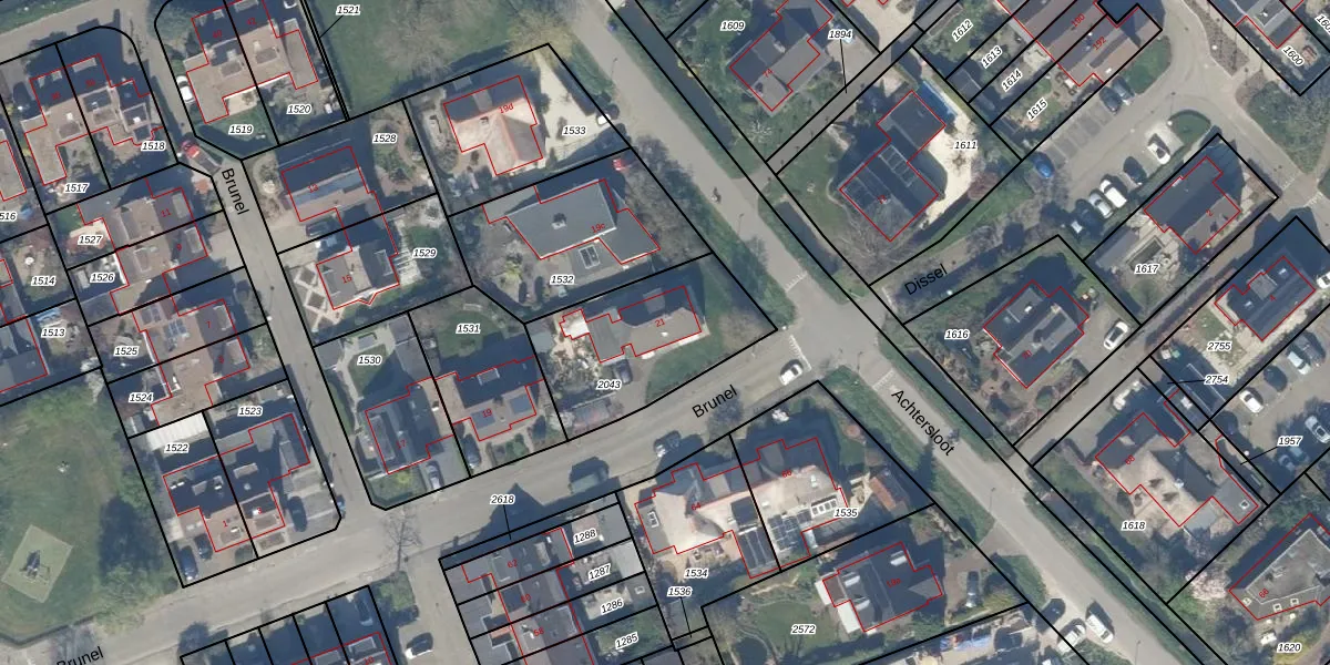 Het perceel waarop Brunel 21 staat heeft een oppervlakte van 573 m². Dit is een groot perceel. De perceeloppervlakte wordt geregistreerd door het Kadaster. Gedetailleerde informatie over de maten van dit perceel kunt u vinden in het rapport Kadastrale kaart met maatvoering van Brunel 21.