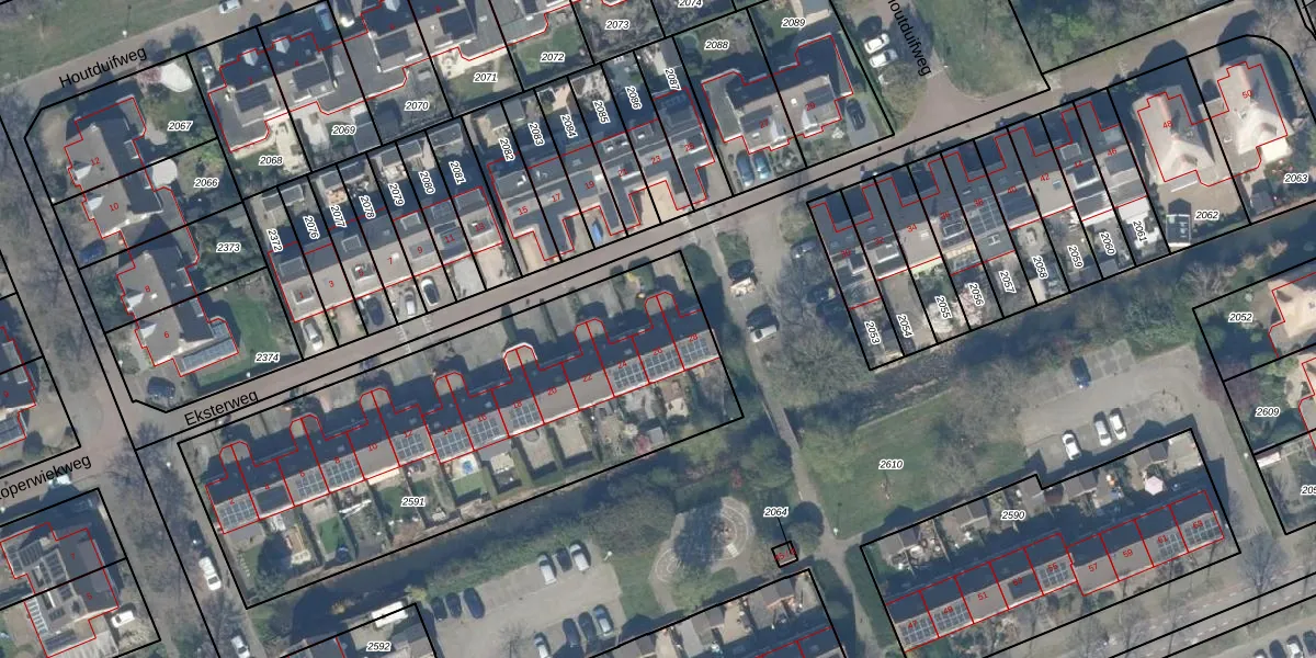 Het perceel waarop Eksterweg 26 staat heeft een oppervlakte van 2215 m². Dit is een zeer groot perceel. De perceeloppervlakte wordt geregistreerd door het Kadaster. Gedetailleerde informatie over de maten van dit perceel kunt u vinden in het rapport Kadastrale kaart met maatvoering van Eksterweg 26.