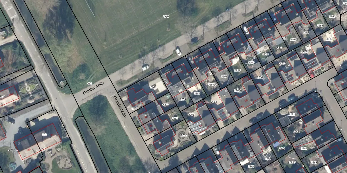 Het perceel waarop Guntersteijn 57 staat heeft een oppervlakte van 245 m². Dit is een middelgroot perceel. De perceeloppervlakte wordt geregistreerd door het Kadaster. Gedetailleerde informatie over de maten van dit perceel kunt u vinden in het rapport Kadastrale kaart met maatvoering van Guntersteijn 57.