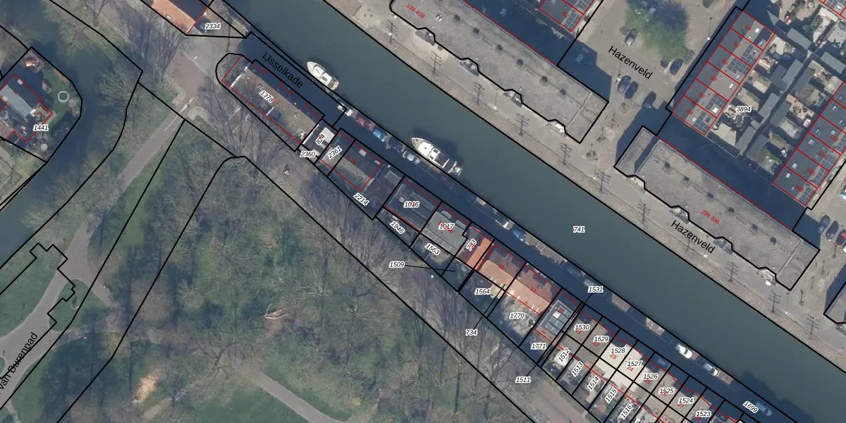 Het perceel waarop IJsselkade 13 staat heeft een oppervlakte van 97 m². Dit is een klein perceel. De perceeloppervlakte wordt geregistreerd door het Kadaster. Gedetailleerde informatie over de maten van dit perceel kunt u vinden in het rapport Kadastrale kaart met maatvoering van IJsselkade 13.