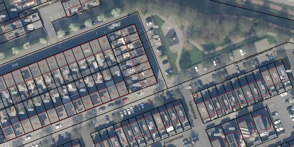 Jacob van Deventerstraat 42 is gelegen op kadastraal perceel ISS00B4500. Deze kadastrale aanduiding is uniek en wordt gebruikt door het Kadaster om eigendomsrechten en andere zakelijke rechten vast te leggen. Het perceel maakt onderdeel uit van de kadastrale gemeente IJsselstein.