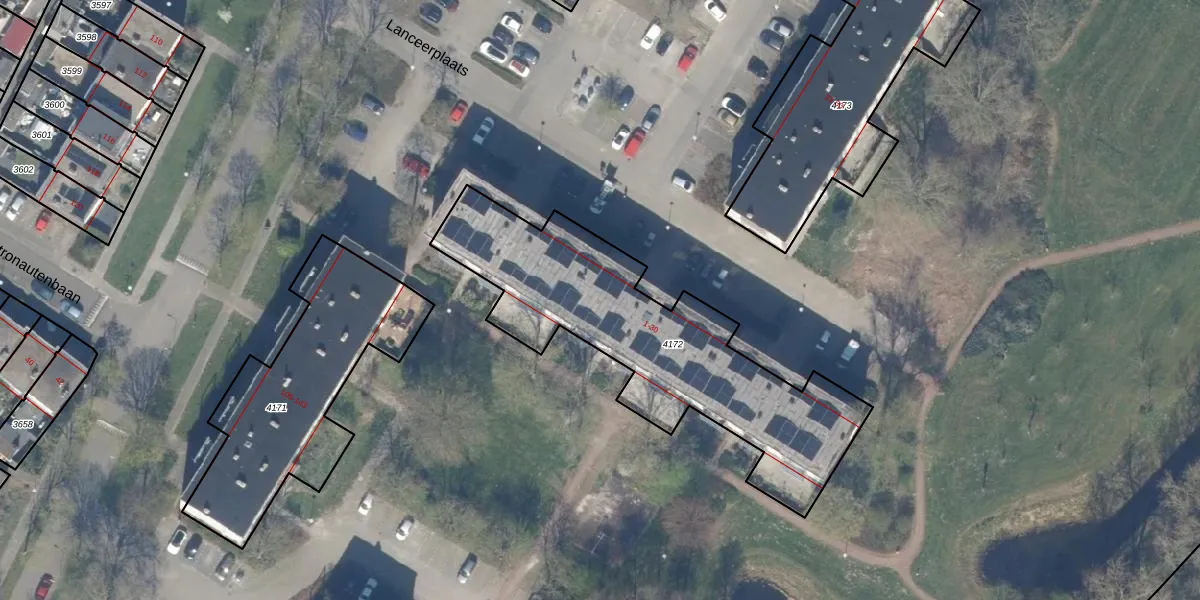 Het perceel waarop Lanceerplaats 13 staat heeft een oppervlakte van 1278 m². Dit is een zeer groot perceel. De perceeloppervlakte wordt geregistreerd door het Kadaster. Gedetailleerde informatie over de maten van dit perceel kunt u vinden in het rapport Kadastrale kaart met maatvoering van Lanceerplaats 13.