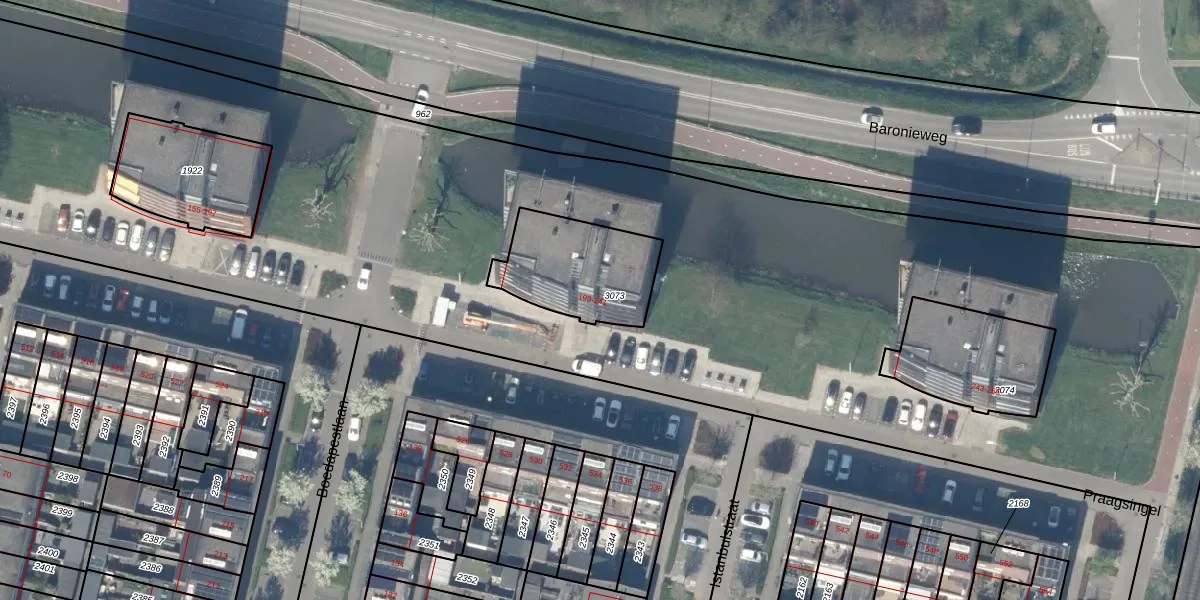 Het perceel waarop Praagsingel 233 staat heeft een oppervlakte van 388 m². Dit is een groot perceel. De perceeloppervlakte wordt geregistreerd door het Kadaster. Gedetailleerde informatie over de maten van dit perceel kunt u vinden in het rapport Kadastrale kaart met maatvoering van Praagsingel 233.