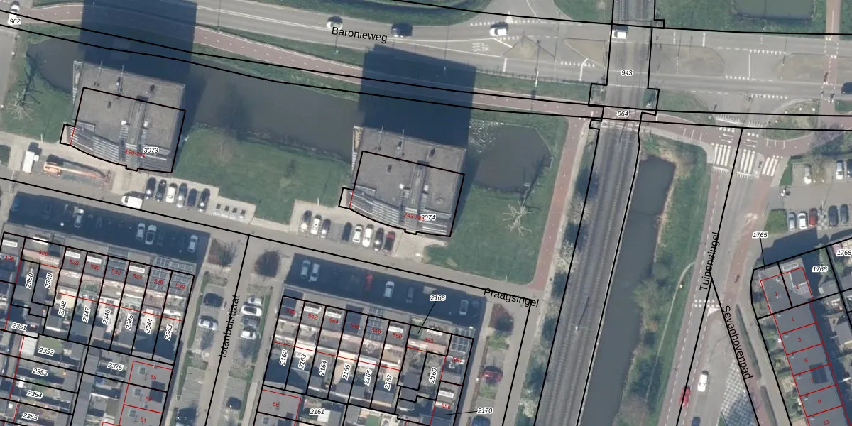 Het perceel waarop Praagsingel 257 staat heeft een oppervlakte van 387 m². Dit is een groot perceel. De perceeloppervlakte wordt geregistreerd door het Kadaster. Gedetailleerde informatie over de maten van dit perceel kunt u vinden in het rapport Kadastrale kaart met maatvoering van Praagsingel 257.