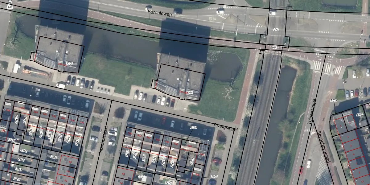 Het perceel waarop Praagsingel 259 staat heeft een oppervlakte van 387 m². Dit is een groot perceel. De perceeloppervlakte wordt geregistreerd door het Kadaster. Gedetailleerde informatie over de maten van dit perceel kunt u vinden in het rapport Kadastrale kaart met maatvoering van Praagsingel 259.