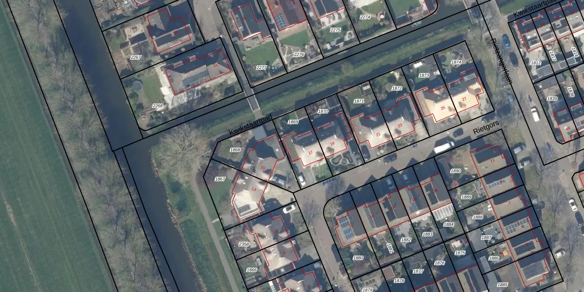 Het perceel waarop Rietgors 17 staat heeft een oppervlakte van 310 m². Dit is een groot perceel. De perceeloppervlakte wordt geregistreerd door het Kadaster. Gedetailleerde informatie over de maten van dit perceel kunt u vinden in het rapport Kadastrale kaart met maatvoering van Rietgors 17.