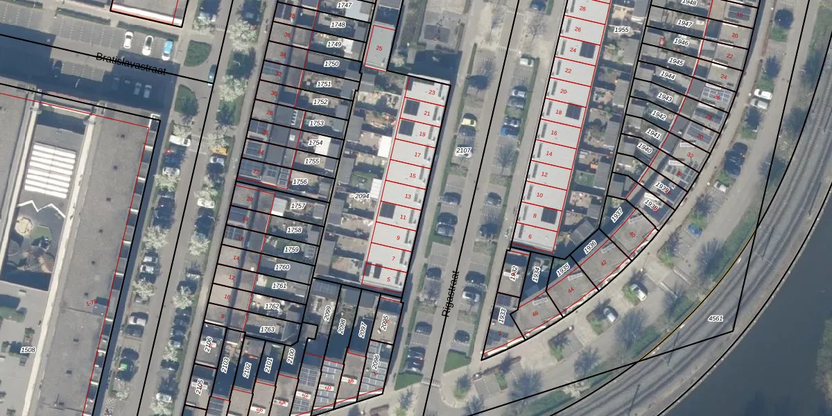 Het perceel waarop Rigastraat 13 staat heeft een oppervlakte van 2056 m². Dit is een zeer groot perceel. De perceeloppervlakte wordt geregistreerd door het Kadaster. Gedetailleerde informatie over de maten van dit perceel kunt u vinden in het rapport Kadastrale kaart met maatvoering van Rigastraat 13.