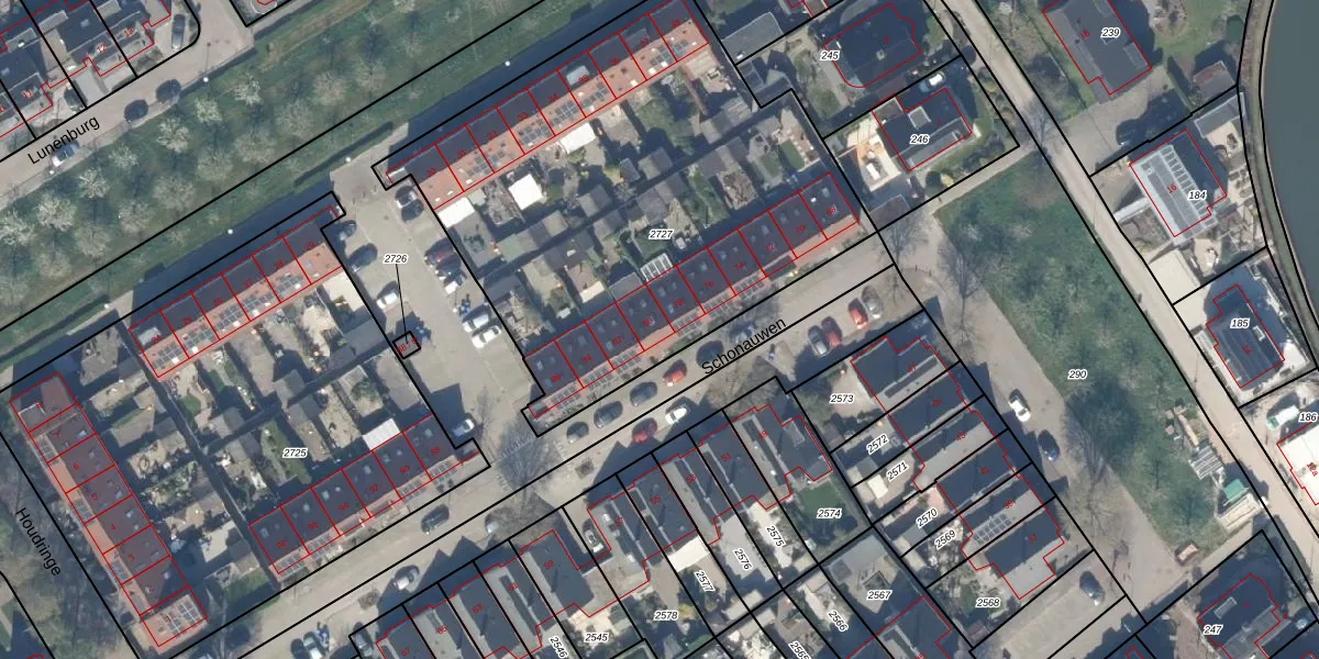Het perceel waarop Schonauwen 80 staat heeft een oppervlakte van 2595 m². Dit is een zeer groot perceel. De perceeloppervlakte wordt geregistreerd door het Kadaster. Gedetailleerde informatie over de maten van dit perceel kunt u vinden in het rapport Kadastrale kaart met maatvoering van Schonauwen 80.