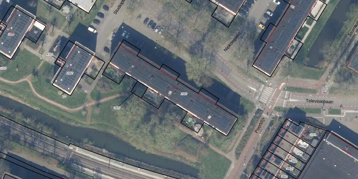 Het perceel waarop Studioplein 24 staat heeft een oppervlakte van 1282 m². Dit is een zeer groot perceel. De perceeloppervlakte wordt geregistreerd door het Kadaster. Gedetailleerde informatie over de maten van dit perceel kunt u vinden in het rapport Kadastrale kaart met maatvoering van Studioplein 24.