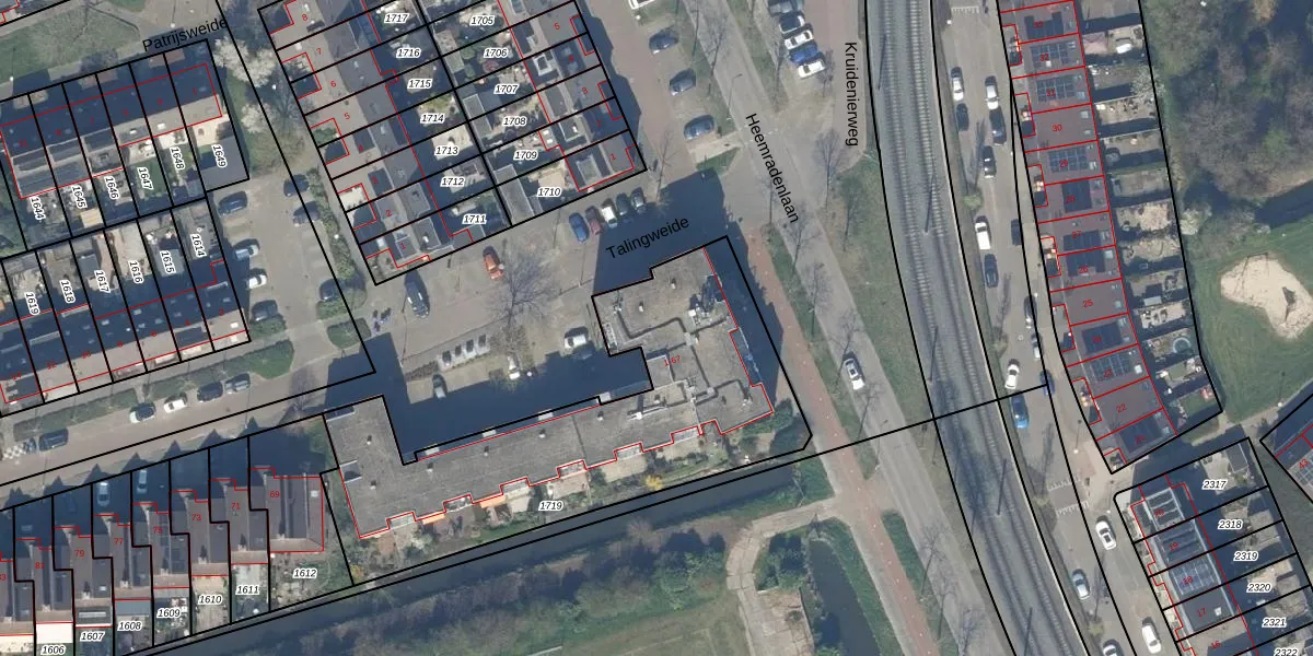 Het perceel waarop Talingweide 35 staat heeft een oppervlakte van 1615 m². Dit is een zeer groot perceel. De perceeloppervlakte wordt geregistreerd door het Kadaster. Gedetailleerde informatie over de maten van dit perceel kunt u vinden in het rapport Kadastrale kaart met maatvoering van Talingweide 35.