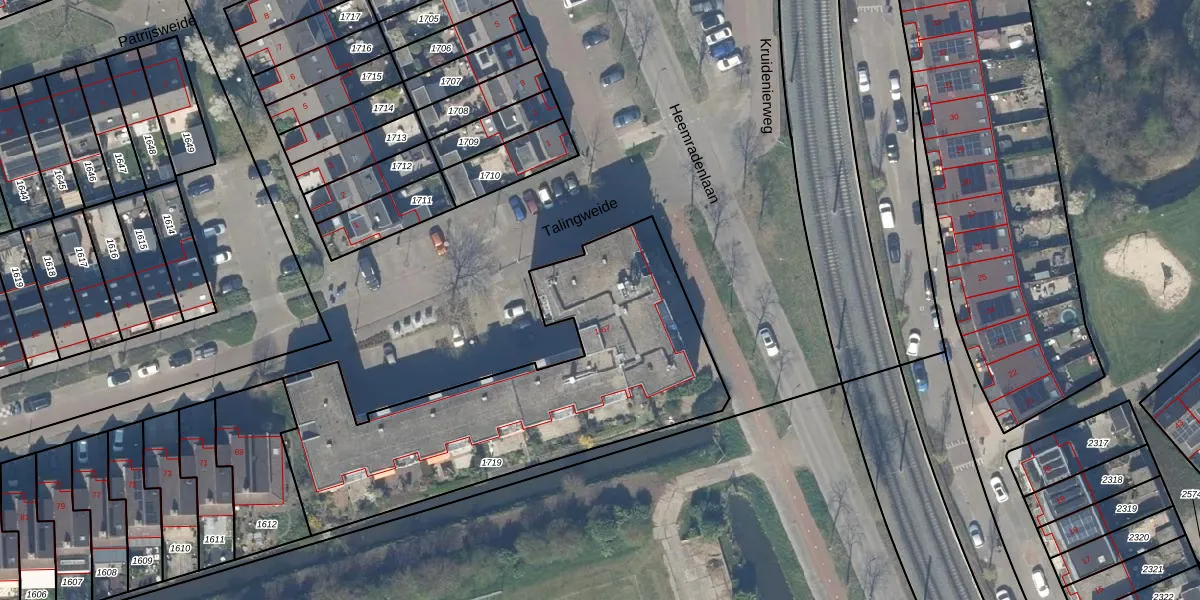 Het perceel waarop Talingweide 37 staat heeft een oppervlakte van 1615 m². Dit is een zeer groot perceel. De perceeloppervlakte wordt geregistreerd door het Kadaster. Gedetailleerde informatie over de maten van dit perceel kunt u vinden in het rapport Kadastrale kaart met maatvoering van Talingweide 37.