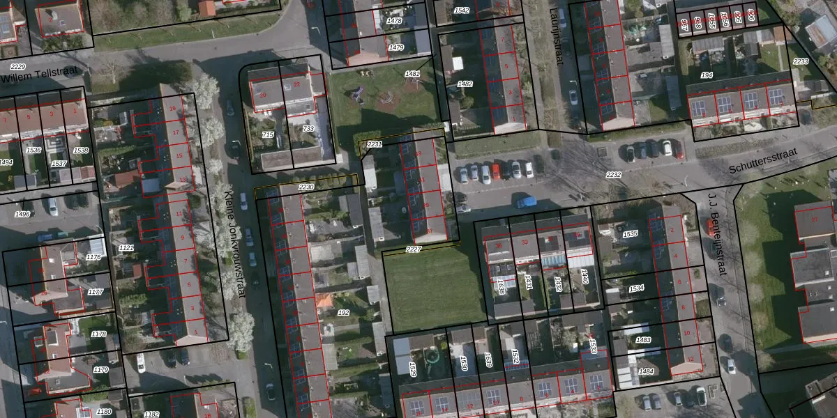 Het perceel waarop Schuttersstraat 39 staat heeft een oppervlakte van 2025 m². Dit is een zeer groot perceel. De perceeloppervlakte wordt geregistreerd door het Kadaster. Gedetailleerde informatie over de maten van dit perceel kunt u vinden in het rapport Kadastrale kaart met maatvoering van Schuttersstraat 39.