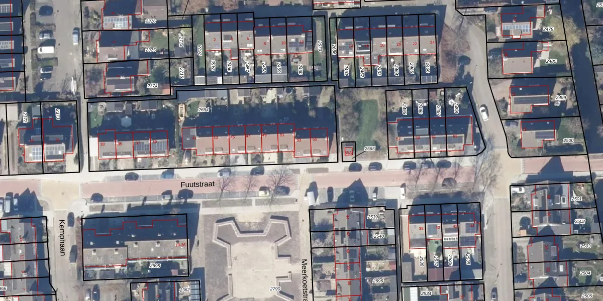 Het perceel waarop Fuutstraat 53 staat heeft een oppervlakte van 2030 m². Dit is een zeer groot perceel. De perceeloppervlakte wordt geregistreerd door het Kadaster. Gedetailleerde informatie over de maten van dit perceel kunt u vinden in het rapport Kadastrale kaart met maatvoering van Fuutstraat 53.