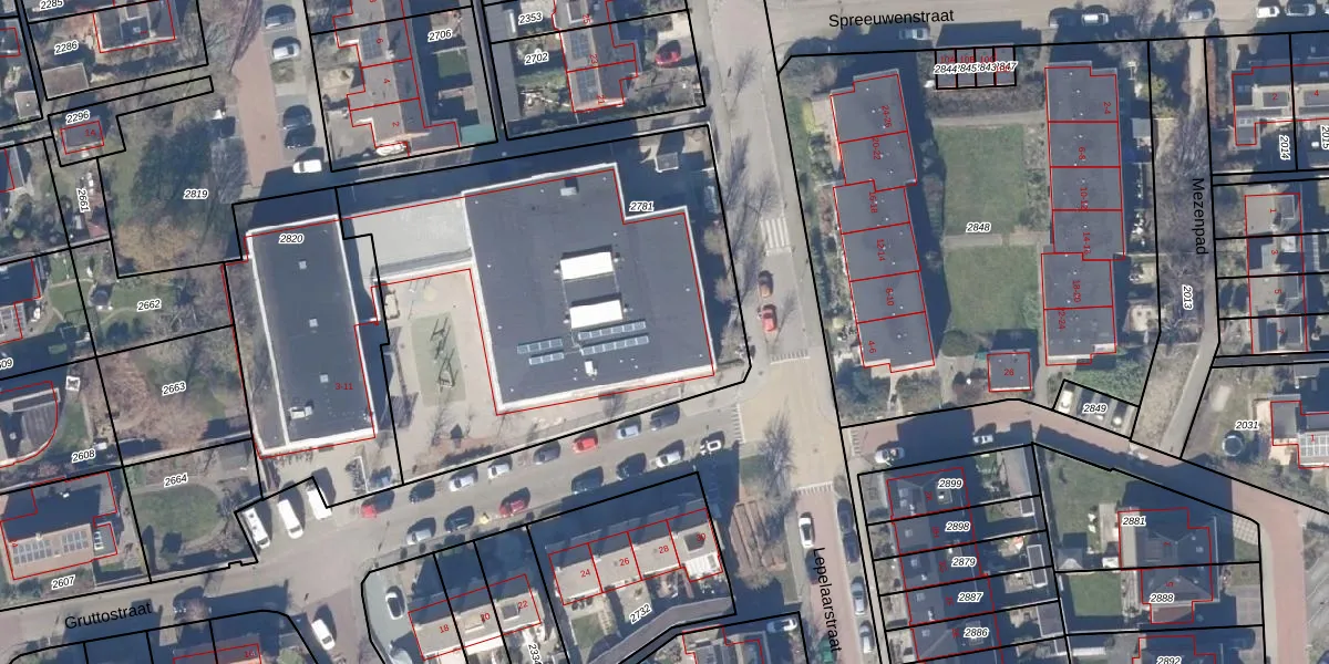 Het perceel waarop Gruttostraat 11 staat heeft een oppervlakte van 2305 m². Dit is een zeer groot perceel. De perceeloppervlakte wordt geregistreerd door het Kadaster. Gedetailleerde informatie over de maten van dit perceel kunt u vinden in het rapport Kadastrale kaart met maatvoering van Gruttostraat 11.