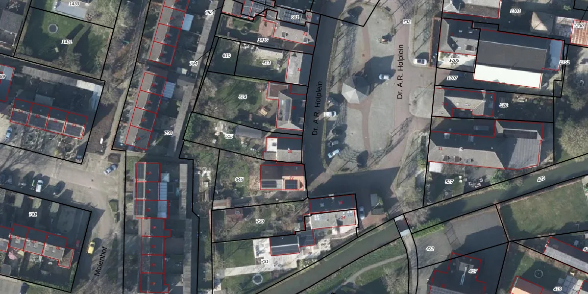 Dr. A.R. Holplein 20 is gelegen op kadastraal perceel LDN04I515. Deze kadastrale aanduiding is uniek en wordt gebruikt door het Kadaster om eigendomsrechten en andere zakelijke rechten vast te leggen. Het perceel maakt onderdeel uit van de kadastrale gemeente Lienden.