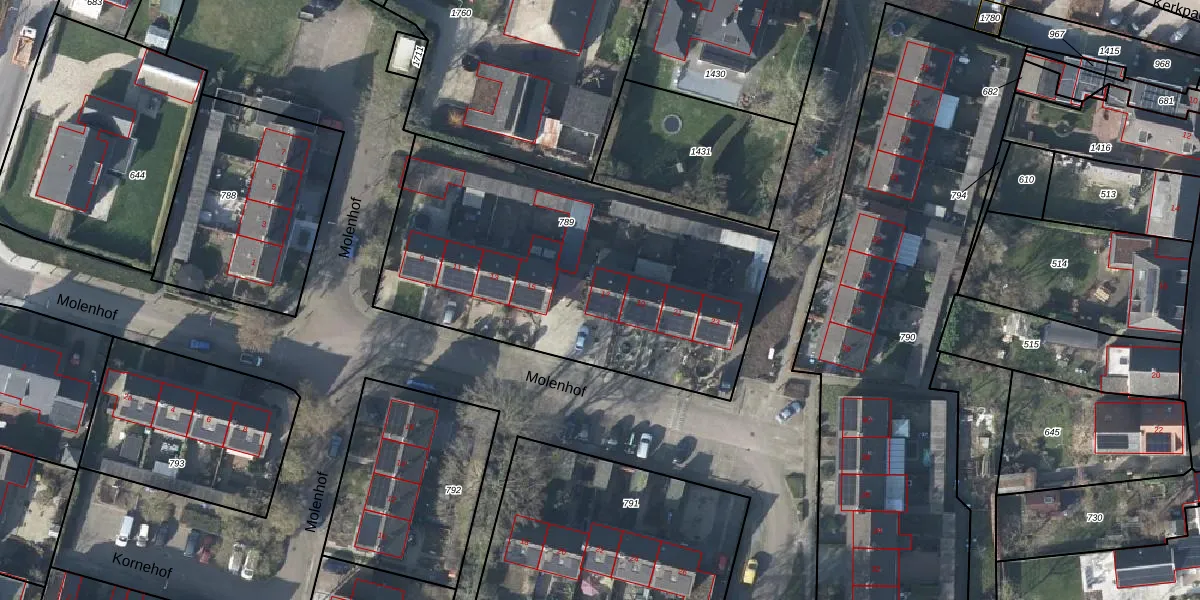 Het perceel waarop Molenhof 17 staat heeft een oppervlakte van 1843 m². Dit is een zeer groot perceel. De perceeloppervlakte wordt geregistreerd door het Kadaster. Gedetailleerde informatie over de maten van dit perceel kunt u vinden in het rapport Kadastrale kaart met maatvoering van Molenhof 17.