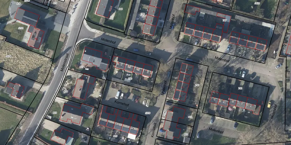 Het perceel waarop Molenhof 8 staat heeft een oppervlakte van 725 m². Dit is een groot perceel. De perceeloppervlakte wordt geregistreerd door het Kadaster. Gedetailleerde informatie over de maten van dit perceel kunt u vinden in het rapport Kadastrale kaart met maatvoering van Molenhof 8.
