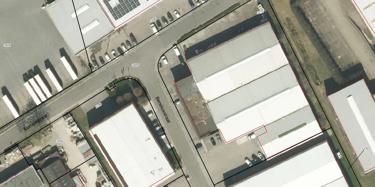 Het perceel waarop Beneluxstraat 4 staat heeft een oppervlakte van 5405 m². Dit is een zeer groot perceel. De perceeloppervlakte wordt geregistreerd door het Kadaster. Gedetailleerde informatie over de maten van dit perceel kunt u vinden in het rapport Kadastrale kaart met maatvoering van Beneluxstraat 4.