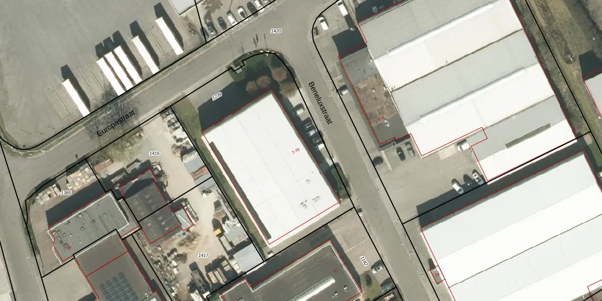 Het perceel waarop Beneluxstraat 7 staat heeft een oppervlakte van 2220 m². Dit is een zeer groot perceel. De perceeloppervlakte wordt geregistreerd door het Kadaster. Gedetailleerde informatie over de maten van dit perceel kunt u vinden in het rapport Kadastrale kaart met maatvoering van Beneluxstraat 7.