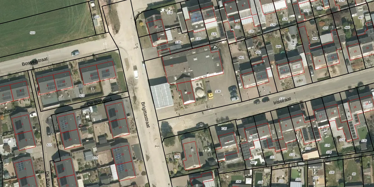 Het perceel waarop Brigittastraat 22-a staat heeft een oppervlakte van 1530 m². Dit is een zeer groot perceel. De perceeloppervlakte wordt geregistreerd door het Kadaster. Gedetailleerde informatie over de maten van dit perceel kunt u vinden in het rapport Kadastrale kaart met maatvoering van Brigittastraat 22-a.