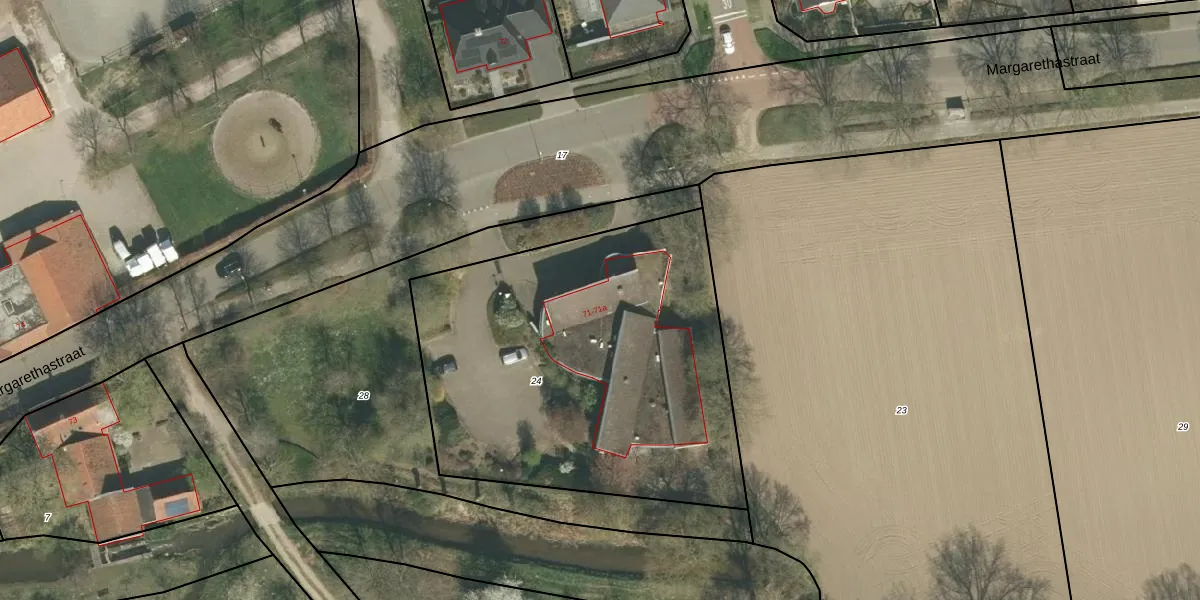 Margarethastraat 71 is gelegen op kadastraal perceel HSL00K24. Deze kadastrale aanduiding is uniek en wordt gebruikt door het Kadaster om eigendomsrechten en andere zakelijke rechten vast te leggen. Het perceel maakt onderdeel uit van de kadastrale gemeente Hunsel.