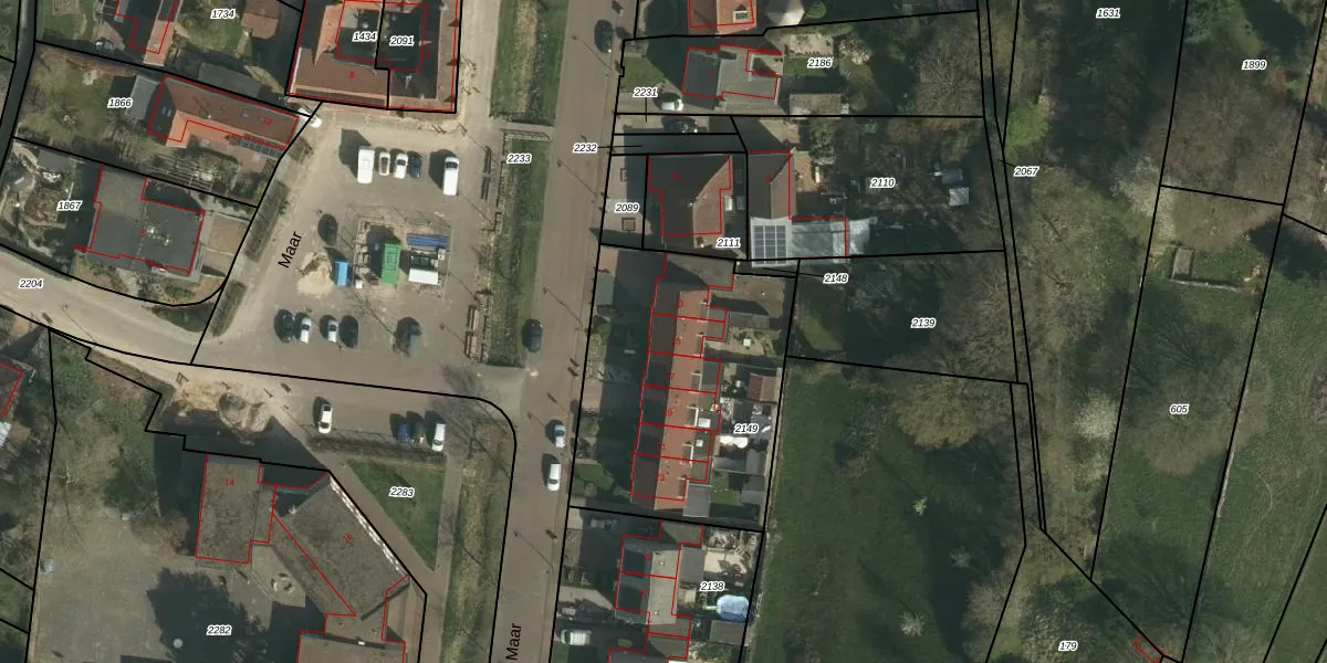 Het perceel waarop Maar 15 staat heeft een oppervlakte van 1210 m². Dit is een zeer groot perceel. De perceeloppervlakte wordt geregistreerd door het Kadaster. Gedetailleerde informatie over de maten van dit perceel kunt u vinden in het rapport Kadastrale kaart met maatvoering van Maar 15.