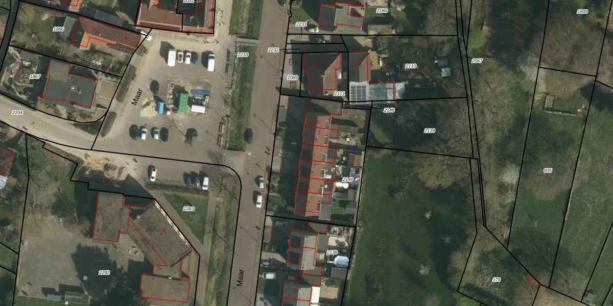 Het perceel waarop Maar 17 staat heeft een oppervlakte van 1210 m². Dit is een zeer groot perceel. De perceeloppervlakte wordt geregistreerd door het Kadaster. Gedetailleerde informatie over de maten van dit perceel kunt u vinden in het rapport Kadastrale kaart met maatvoering van Maar 17.