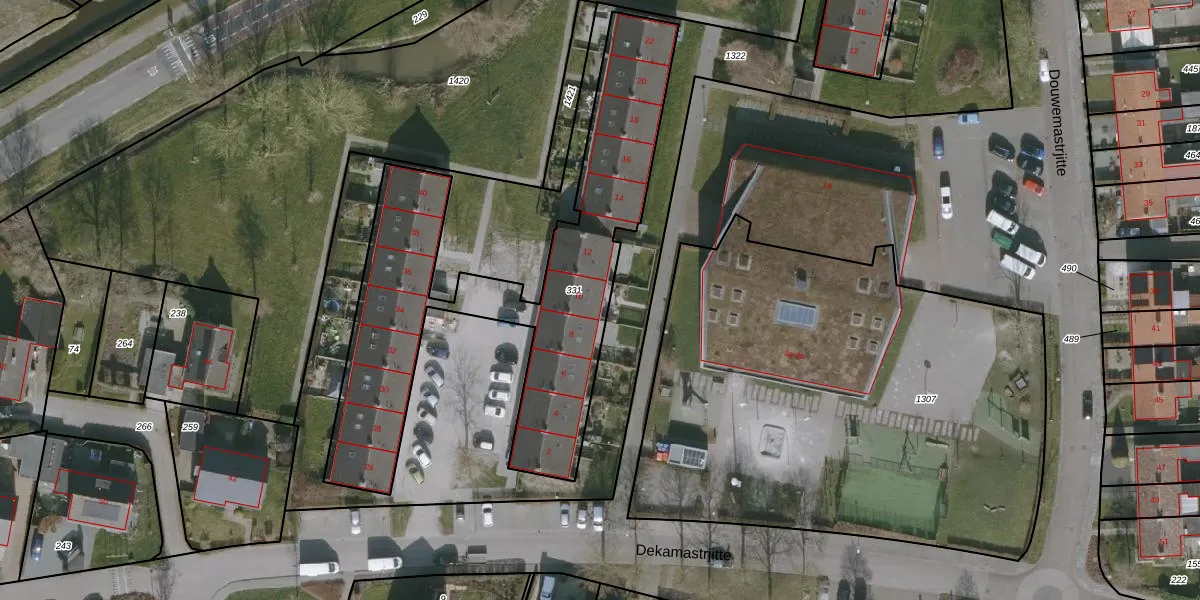 Dekamastrjitte 10 is gelegen op kadastraal perceel GRO00L331. Deze kadastrale aanduiding is uniek en wordt gebruikt door het Kadaster om eigendomsrechten en andere zakelijke rechten vast te leggen. Het perceel maakt onderdeel uit van de kadastrale gemeente Grouw.