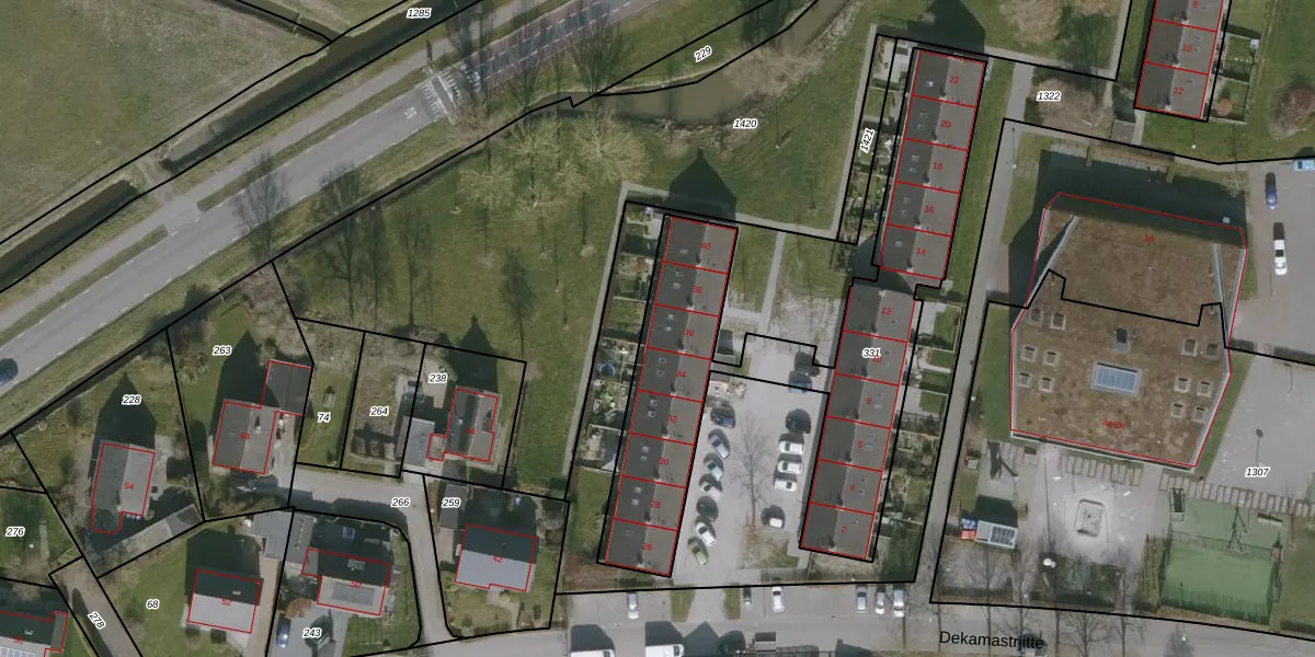 Het perceel waarop Dekamastrjitte 36 staat heeft een oppervlakte van 1580 m². Dit is een zeer groot perceel. De perceeloppervlakte wordt geregistreerd door het Kadaster. Gedetailleerde informatie over de maten van dit perceel kunt u vinden in het rapport Kadastrale kaart met maatvoering van Dekamastrjitte 36.
