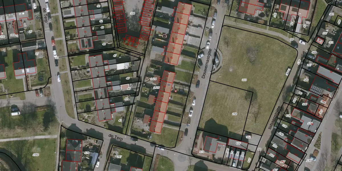 Het perceel waarop Douwemastrjitte 66 staat heeft een oppervlakte van 2585 m². Dit is een zeer groot perceel. De perceeloppervlakte wordt geregistreerd door het Kadaster. Gedetailleerde informatie over de maten van dit perceel kunt u vinden in het rapport Kadastrale kaart met maatvoering van Douwemastrjitte 66.