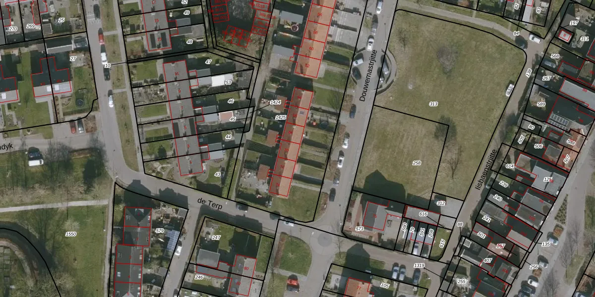 Het perceel waarop Douwemastrjitte 70 staat heeft een oppervlakte van 2585 m². Dit is een zeer groot perceel. De perceeloppervlakte wordt geregistreerd door het Kadaster. Gedetailleerde informatie over de maten van dit perceel kunt u vinden in het rapport Kadastrale kaart met maatvoering van Douwemastrjitte 70.