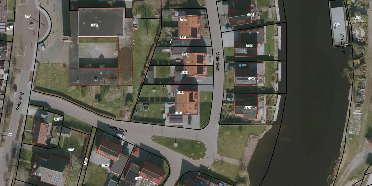 Het perceel waarop Molehiem 25 staat heeft een oppervlakte van 395 m². Dit is een groot perceel. De perceeloppervlakte wordt geregistreerd door het Kadaster. Gedetailleerde informatie over de maten van dit perceel kunt u vinden in het rapport Kadastrale kaart met maatvoering van Molehiem 25.