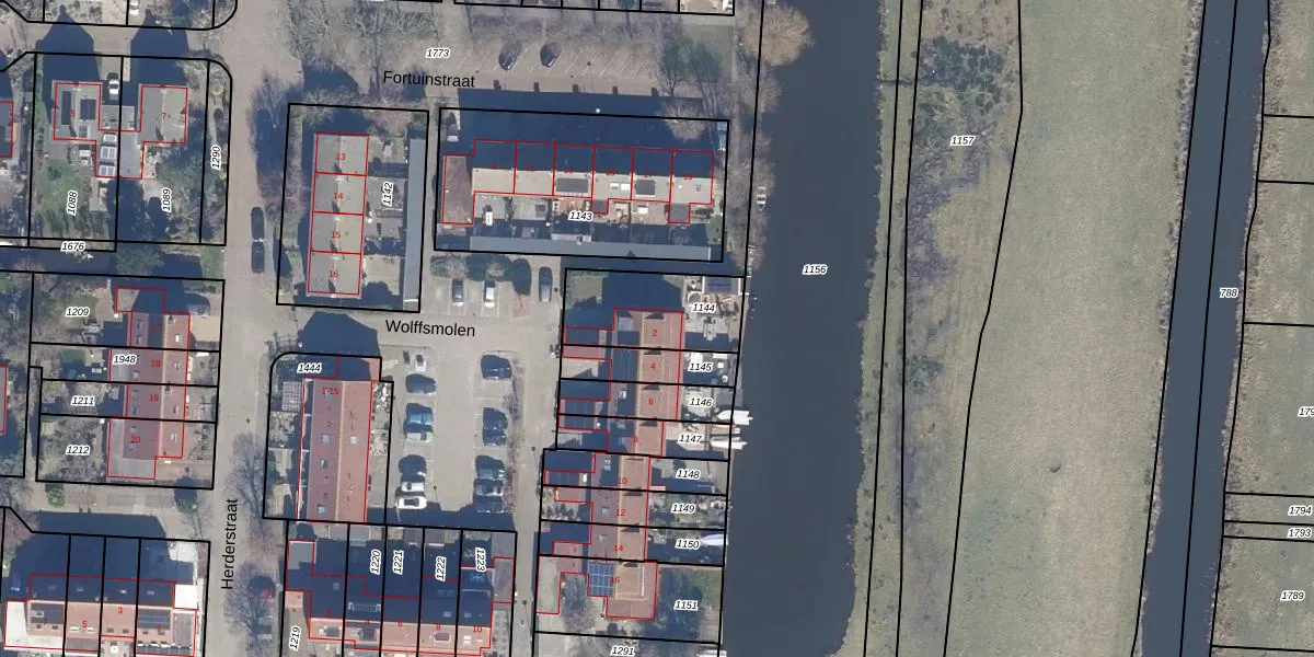 Het perceel waarop Wolffsmolen 2 staat heeft een oppervlakte van 315 m². Dit is een groot perceel. De perceeloppervlakte wordt geregistreerd door het Kadaster. Gedetailleerde informatie over de maten van dit perceel kunt u vinden in het rapport Kadastrale kaart met maatvoering van Wolffsmolen 2.