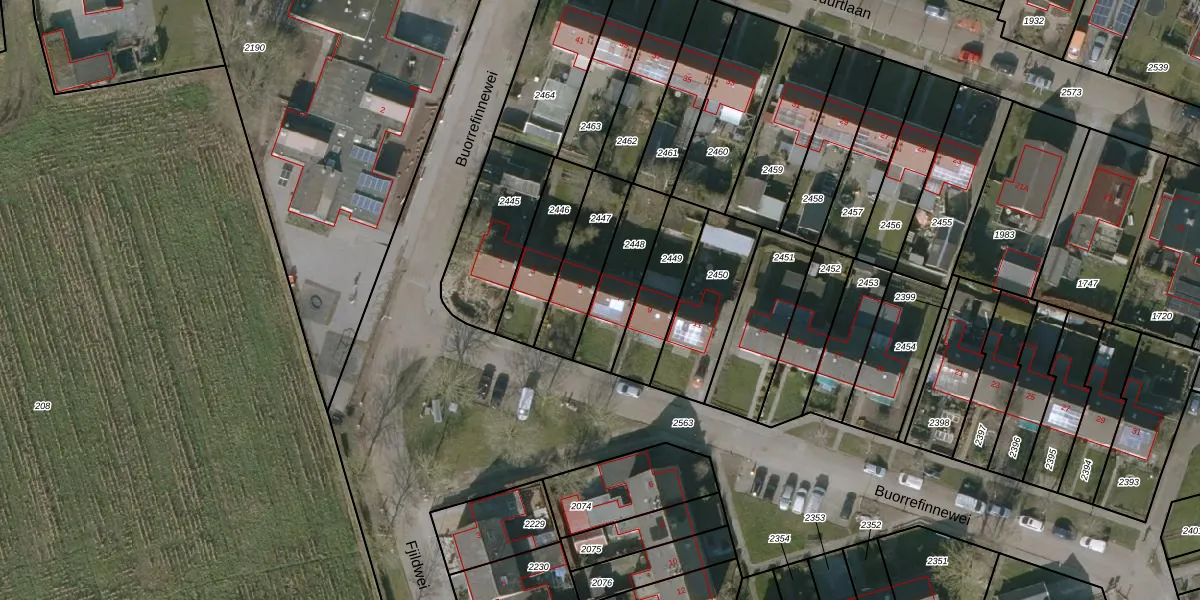 Buorrefinnewei 7 is gelegen op kadastraal perceel OTM00G2448. Deze kadastrale aanduiding is uniek en wordt gebruikt door het Kadaster om eigendomsrechten en andere zakelijke rechten vast te leggen. Het perceel maakt onderdeel uit van de kadastrale gemeente Oostermeer.